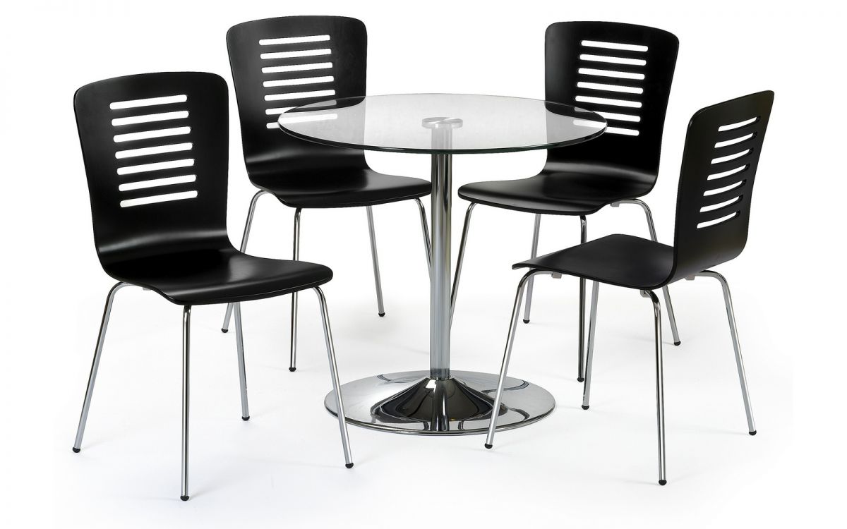 A contemporary chrome and glass pedestal table that is perfect for the modern kitchen diner.